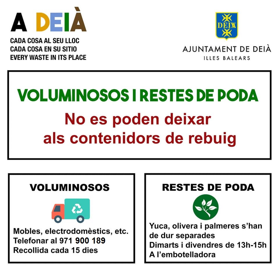 Heu de telefonar al 971900189 i vos diran quan ( un dijous sí i un no) i on (davant casa o al contenidor més proper) vos recolliran les andròmines que voleu tirar (màxim 3 cada vegada).