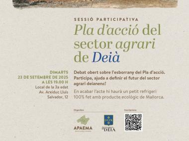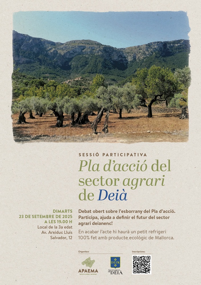 El dimarts 23 de setembre, a les 19 hores, al local de la tercera edat, tindrà lloc la presentació de l'esborrany del pla d'acció del sector agrari per al nostre municipi.
