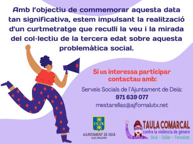 AMB L'OBJECTIU DE COMMEMORAR AQUESTA DATA SIGNIFICATIVA, ESTEM IMPULSANT LA REALITZACIÓ D'UN CURTMETRATGE QUE RECULLI LA VEU I LA MIRADA DEL COL.LECTIU DE LA TERCERA EDAT SOBRE AQUESTA PROBLEMÀTICA SOCIAL.